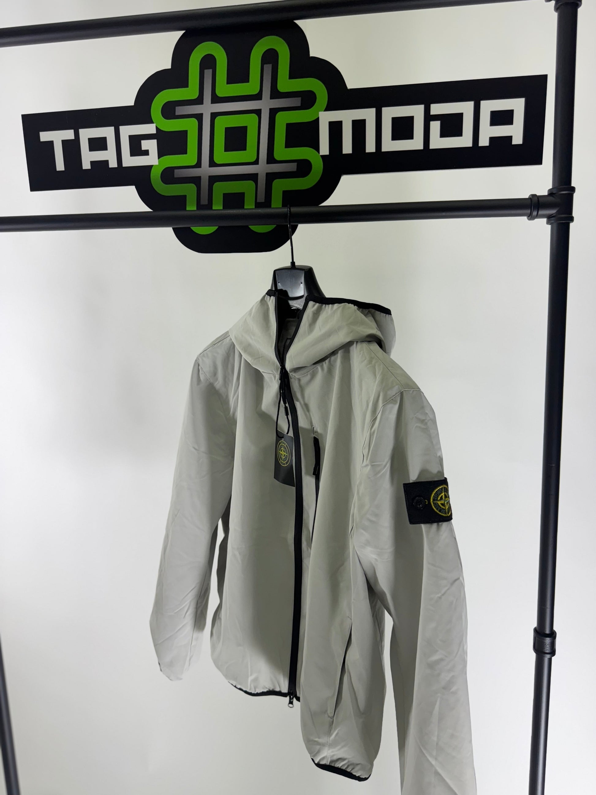 Giacca Grigio chiaro, con zip, applicazione frontale con logo alla spalla, cappuccio, chiusura frontale con zip, due tasche laterali con zip e maniche lunghe.