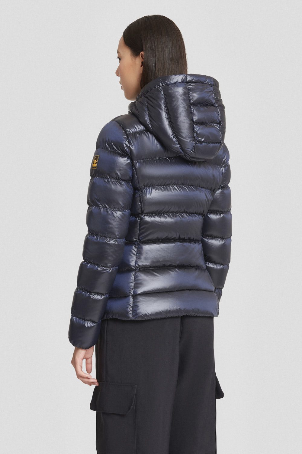 Piumino blu con cappuccio, 200 grammi e realizzato in tessuto microripstop lucido a trama nera e imbottito con vera piuma certificata 800 fill power.